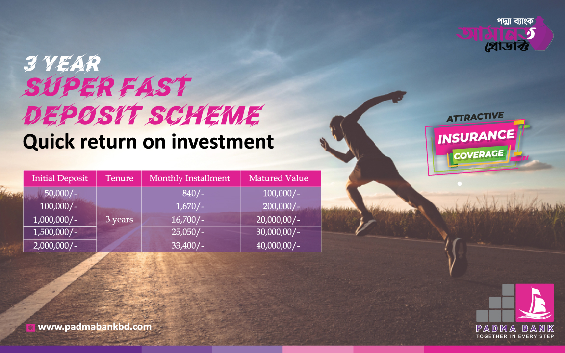 3 Year Super Fast Deposit Scheme is a unique deposit scheme with attractive insurance facility where a customer can receive quick return on investment within a short tenure. Customer has to provide initial deposit just for once and monthly installments during the tenure of the scheme.